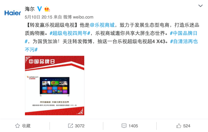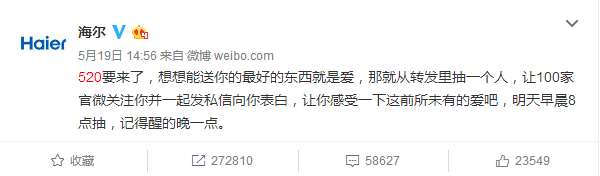 520表白日,海爾搞了一個(gè)事情,聯(lián)合60多家藍(lán)V,給一位幸運(yùn)粉絲送禮物。這條轉(zhuǎn)發(fā)評(píng)論送禮物的微博在半個(gè)小時(shí)之內(nèi)就轉(zhuǎn)發(fā)過(guò)萬(wàn)。