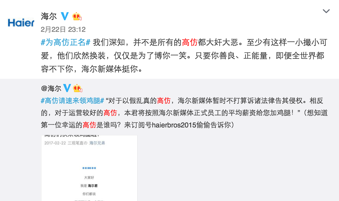 不知道從什么時(shí)候開(kāi)始,平時(shí)刷微博時(shí)你會(huì)發(fā)現(xiàn)很多的高仿號(hào),潛伏于各大評(píng)論中真假難辨。@海爾作為藍(lán)V總教頭,也遇見(jiàn)過(guò)很多海爾的高仿號(hào),后來(lái)發(fā)現(xiàn),其實(shí)這些高仿號(hào)是海爾的年輕用戶,他們想搶熱門(mén),跟你的粉絲有效互動(dòng)。面對(duì)這么一批可愛(ài)的小粉絲,@海爾沒(méi)有封殺,而是做官方聲明,只要你善良,且正能量,哪怕全世界都不管你我們呼喚你,甚至還給高仿號(hào)發(fā)福利。