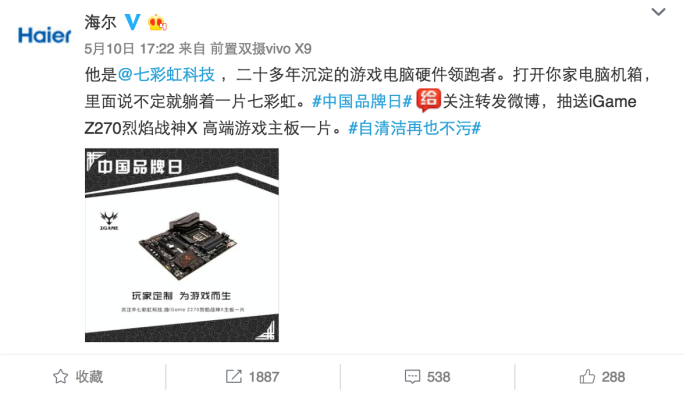 海爾對(duì)于幫其他品牌打廣告這件事態(tài)度也很開(kāi)放。國(guó)家品牌日當(dāng)別人家都在為自己打廣告的時(shí)候,海爾官微開(kāi)放廣告位,為其他企業(yè)打廣告。