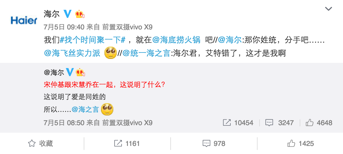 海爾搶熱門(mén)的能力在前幾天宋仲基宋慧喬公布戀情時(shí),再次得到了印證。海爾迅速get到了宋仲基和宋慧喬同姓的點(diǎn),發(fā)微博@和自己同姓的品牌強(qiáng)行組CP,同姓組CP這個(gè)點(diǎn)也很容易被模仿,藍(lán)V參與度也異常高漲,比如"海信@海天醬油"、白貓凈界@白敬亭"等等。